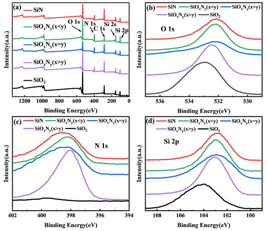 XPS analyzed different thin film samples: (a) survey peaks, (b) O 1s spectra, (c) N 1s spectra, and (d) Si 2p spectra.