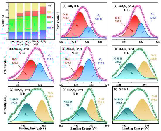 (a) The proportion of different elements inside the film. XPS analysis of the SiO2, SiOxNy, and SiN samples on the (b–e) O 1s, and (f–i) N 1s spectra.