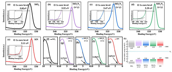 Valence band spectra (Figure 7f–j) demonstrate concurrent electronic structure reorganization, showing valence band maxima (VBM) upward shifts from 3.1 eV (SiO2) to 1.8 eV (SiN) relative to the Fermi level. Bandgap narrowing from 8.9 eV to 5.1 eV, derived from Tauc plot analysis, correlates with nitrogen-induced Si-N antibonding state formation and VO-mediated mid-gap levels. The reconstructed band diagram (Figure 7k) illustrates this dual mechanism: nitrogen incorporation reduces conduction band offset by 0.7 eV through Si-N σ* orbital hybridization, while oxygen vacancies introduce defect states 0.3 eV above the original VBM, collectively enhancing electrical conductivity (σ = 10−12 → 10−8 S/cm) and optical absorption onset redshift (λedge = 140 → 240 nm) [38,39,40,41]. These coordinated electronic modifications confirm that nitrogen–oxygen stoichiometry controls both localized bonding configurations and macroscopic optoelectronic properties in SiON dielectrics.