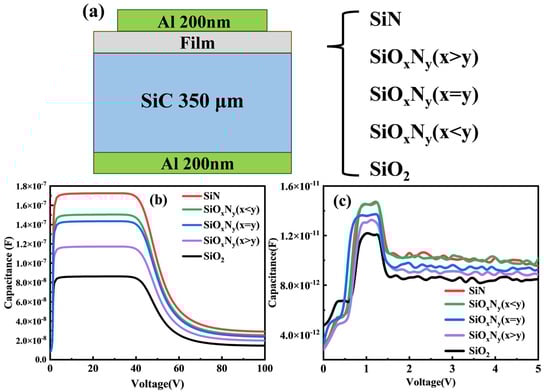 To investigate the dielectric properties of stoichiometrically engineered Si-O-N films, metal–insulator–metal (MIS) capacitors were fabricated by depositing 200 nm aluminum electrodes via electron beam evaporation (base pressure < 5 × 10−6 Torr) on both surfaces of the dielectric layers (Figure 8a). Silvaco TCAD simulations (Figure 8b) and experimental C-V measurements (1 MHz, ±10 V sweep) reveal nitrogen-dependent dielectric enhancement, with simulated capacitance increasing from 3.0 pF/μm2 (SiO2) to 4.2 pF/μm2 (Si3N4) in accumulation region. Experimental results (Figure 8c) confirm this trend but exhibit critical deviations: SiO2 shows 17% higher experimental capacitance (3.5 vs. 3.0 pF/μm2) due to interfacial roughness (RMS = 0.7 nm) and oxygen vacancy gradients (ΔVO = 1017–1018 cm−3) not modeled in simulations.