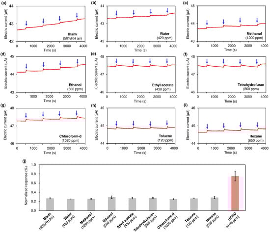 Sensing responses for non-carbonyl VOC vapors: (a) blank air (50% RH), (b) water, (c) methanol, (d) ethanol, (e) ethyl acetate, (f) tetrahydrofuran, (g) chloroform-d, (h) toluene, and (i) hexane. Temporary removal (30 s) of the thin plastic plate was repeated every 1000 s (four times per run as indicated by the blue arrows). Values (in ppm) quoted at the bottom right in each panel indicate the concentration of water or each VOC added into the airflow (50% RH). (j) Normalized sensing responses for each vapor. The average of four repeated measurements, along with their standard deviation, is shown. Since conventional chloroform (CHCl3) contains ethanol as a stabilizer, chloroform-d (CDCl3, NMR grade) was used in this study.