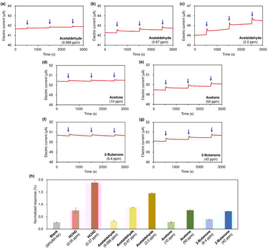Sensing responses for carbonyl-containing VOC vapors. (a–c) acetaldehyde, (d,e) acetone, and (f,g) 2-butanone. (h) Normalized sensing responses for carbonyl vapors. The average of three repeated measurements, along with their standard deviation, is shown.