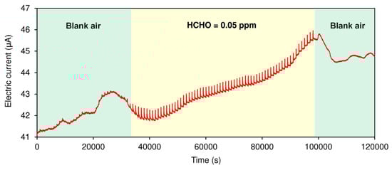 Under continuous exposure to HCHO in air (50% RH), the thin plastic plate located between the HA and SWCNT-based chemiresistor was periodically removed for 30 s every 1000 s (Figure 1a and Figure S1). As the HCHO concentration increases, the electric current at the SWCNT-based chemiresistor also increases due to p-doping with HCl (Figure 2a–f) [36,37,38]. Insertion of the plastic plate leads to the recovery of the original electric current even in the presence of HCHO because of the desorption of HCl from the SWCNT surface. Thus, regeneration of the sensor is possible without using a purge (i.e., HCHO-free) gas. The normalized response (%) can be calculated from Equation (1).