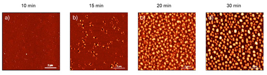 To track the changes in film roughness during various annealing stages, AFM measurements were carried out (Figure 1). In the first 10 min of annealing, the layer showed an increase in the root mean square roughness (RMS) from about 0.10 nm (as grown sample) to 0.35 nm (Figure 1a). The RMS further increased up to 5.2 nm (Figure 1b), as the annealing time continued, as can be expected. After 15 min of annealing, a substantial change in the morphological features of the surface was observed: while voids appeared (dark spots), features with a greater height also started to form (bright spots) around voids. After 20 min of annealing, the surface presented bright structures, which were mainly connected (Figure 1c), whereas after 30 min of annealing, the surface was covered with isolated structures (Figure 1d). Regardless of the specific temperature at which the dewetting instability occurs, the variation in roughness and the subsequent rupture of the film at the interface are characteristic of a typical dewetting process in silicon-based alloys [8,17,18].