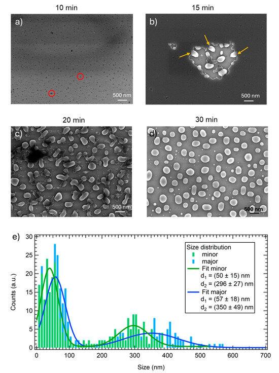 SEM images acquired in planar view after annealing for (a) 10 min, (b) 15 min, (c) 20 min, (d) 30 min. (e) Size distributions of the SiGe islands for the minor and major axes, evaluated considering several SEM images acquired on the 30 min annealed sample. The key reports the mean values of the bimodal distributions. Red circles in panel (a) indicate voids, while yellow arrows in panel (b) indicate the short fingers formed during the SSD process.