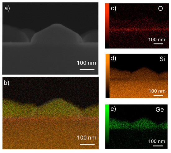 SEM image acquired in cross view (90°) on the 30 min annealed sample with corresponding EDX mapping. (a) SEM cross section image; (b) sum of chemical elements present in the sample: red is oxygen, orange is silicon, and green is germanium. Single element maps: (c) oxygen; (d) silicon; (e) germanium.