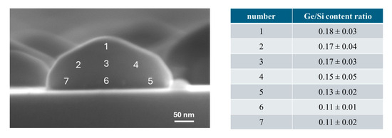 To better understand whether different Ge content is present inside the islands, single spectra have been acquired in different regions of several islands, and the relative Ge/Si composition results obtained by a statistical analysis are reported in Figure 4. From this analysis, it is clear that a gradient is present. The islands are richer in Ge at the top, while at the bottom the Ge content is lower. This is in agreement with an interdiffusion process of silicon from the SOI layer, which has been already observed in the literature [51].