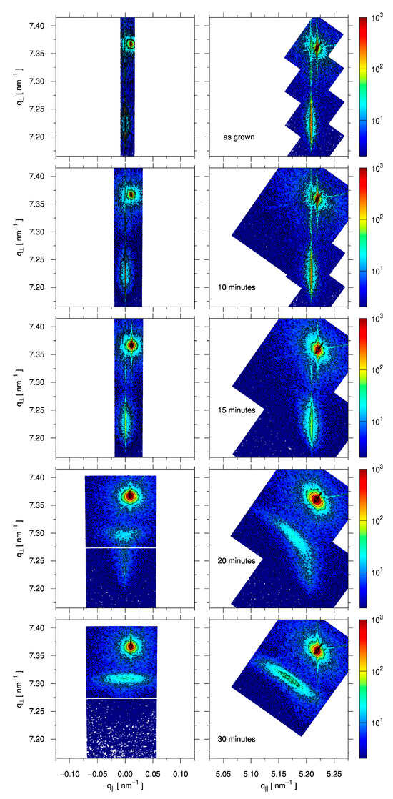 Reciprocal space maps (RSMs) around the (004) (left) and (224) Bragg peaks. The sharp Si bulk peak can be seen in the top right. The thin SOI “device” layer is slightly misaligned with respect to the “handle” substrate. The epitaxial SiGe layer is well-aligned to the device layer, as is especially clear in the first three samples (as-grown, 10 min, 15 min). No appreciable strain relaxation occurs up to 15 min, but some broadening of the SiGe peak occurs after 15 min due to the introduction of the first defects. At 20 min, the formation of a relaxed SiGe layer containing less Ge can be seen, and at 30 min the whole film is relaxed.