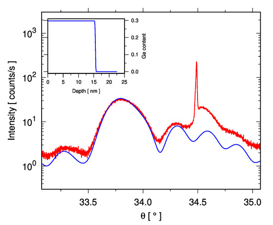 Double-crystal (004) ω-2θ scan (red curve) of the “Flat” as-grown sample, showing the broad SiGe peak at θ = 33.6° with intensity from the Si “device” and “handle” substrate around θ = 34.5°. Note that the peak from the handle is weak and shifted in position since it is not exactly in the Bragg condition (there is about 0.1° tilt between the (001) planes of the device and handle). The inset shows the Ge profile used to calculate the dynamical Darwin model simulation (blue curve).