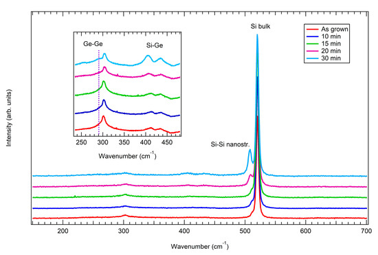 Starting with annealing and increasing the annealing time, all the peaks remain present in the samples, even if there are some differences: the peak around 510.8 cm−1 appears downshifted and more intense on increasing the annealing time, as do the Si-Ge and Ge-Ge vibrational modes. This is related to the relaxation of the strain of the samples as well as of the reducing Ge content, as seen by XRD, and that will be further analyzed in the Section 4 of the manuscript.
