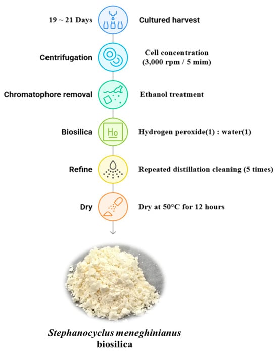 The culture of S. meneghinianus was maintained by subculturing during the period of highest cell density, between days 19 and 21, to ensure consistent growth. During the peak growth phase, single-cell cultures of S. meneghinianus were harvested by centrifugation at 3000 rpm for 5 min. The supernatant was discarded, and the concentrated cells were subjected to chloroplast removal by incubation in 95% ethyl alcohol (Samchun Pure Chemical, Pyeongtaek, Republic of Korea) for 24 h. Subsequently, a mixture of 35% hydrogen peroxide (H2O2, Junsei) and distilled water (1:1, v/v) were added, and the suspension was left to stand for 24 h to perform a pretreatment process, separating the epitheca and hypotheca of S. meneghinianus. For purification, the pretreated S. meneghinianus cells were centrifuged at 3000 rpm for 5 min, the supernatant was removed, and the pellet was resuspended in distilled water. This washing process was repeated 5 to 6 times to remove residual reagents and impurities. The purified S. meneghinianus frustules were then dried at 50 °C for 12 h. The final biosilica materials were obtained as isolated frustules of S. meneghinianus, as shown in Figure 2.