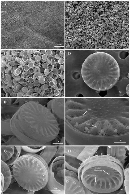 When only hydrogen peroxide was used without ethanol pretreatment, it was difficult to obtain pure biosilica from S. meneghinianus due to incomplete removal of chloroplast residues (Figure 5A,B). However, when ethanol treatment was applied prior to hydrogen peroxide treatment, pure white diatom frustules were successfully obtained (Figure 5C,D). Analysis of the microstructure of S. meneghinianus after pretreatment and purification confirmed the complete separation of the epitheca and hypotheca, as well as the effective removal of mucilage materials (Figure 6). Notably, despite undergoing pretreatment and purification processes, no morphological or structural damage was observed in the frustules of S. meneghinianus, including the preservation of striae, costae, fultoportulae, spines, and the porous architecture (Figure 6D–H). Moreover, the separation of the epitheca and hypotheca allowed for detailed observation of the internal structures, including the clear identification of rimoportulae and fultoportulae (Figure 6H). This separation is expected to provide a larger surface area for the loading of active substances, such as pharmaceuticals or cosmetic agents, thereby enhancing its potential as a functional biomaterial [].