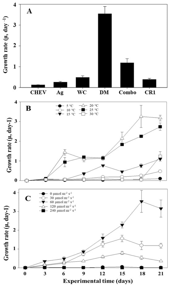 Growth rates of S. meneghinianus under various culture (A), temperature (B), and light conditions (C).