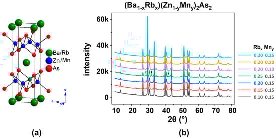 (a) The crystal structure of (Ba,Rb)(Zn,Mn)2As2. (b) X-ray diffraction (XRD) pattern of the powder specimen (Ba1−xRbx)(Zn1−yMny)2As2, where x = 0.10, 0.15, 0.20, and 0.25; y = 0.10, 0.15, 0.20 and 0.25. The black arrow indicates the low-temperature BaZn2As2-based phase, which belongs to the space group Pnma [16].