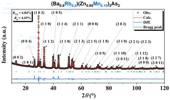 Like the parent compounds, β-BaZn2As2 and BKZMA [16], (Ba1−xRbx)(Zn1−yMny)2As2 (where x = 0.10, 0.15, 0.20, and 0.25; y = 0.10, 0.15, 0.20, and 0.25) also crystallizes in the ThCr2Si2-type structure, as illustrated in Figure 1. This compound features alternating layers of Ba or Rb, and (Zn,Mn)As, formed from edge-sharing ZnAs4 tetrahedra, resulting in a quasi-two-dimensional (2D) architecture (Figure 1a). The X-ray diffraction (XRD) patterns (Figure 1b) and the refined data obtained from the powder specimen of (Ba0.8Rb0.2)(Zn0.85Mn0.15)2As2, analyzed through Rietveld refinement (Figure 2), can be accurately indexed to a single phase. The resultant weighted reliability factor (Rwp) is approximately 6.84%, which shows a reliable analysis.