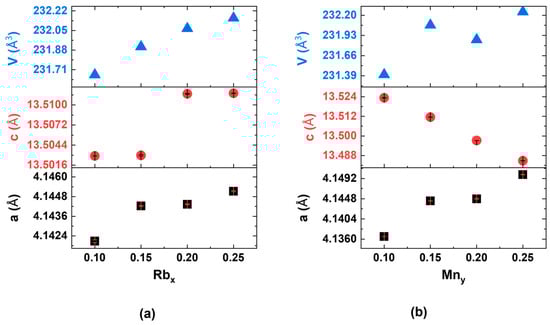 The larger ionic radius of Rb+ (1.52 Å) compared to Ba2+ (1.35 Å) results in a monotonic variation in lattice parameters with Ba2+/Rb+ replacement (Figure 3a), with the coordination numbers of six, consistent with Vegard’s law [38] and confirming successful chemical doping. Vegard’s law for alloyed materials is a linear function: Ealloy = xEA +(1 − x)EB, where EA, EB, and Ealloy are the respective properties of pure A, Pure B, and the alloy AxB1−x, and x is the fraction of one ingredient in a materials point. The replacement of Zn2+/Mn2+ magnetic ions shows distinct behaviors, as illustrated in Figure 3b. The unit cell volume increases due to the smaller ionic radius of Zn2+ (0.60 Å) compared to Mn2+ (0.66 Å), with the coordination numbers of four. However, there was an increase in the a-axis and a decrease in the c-axis. It is important to note that the length of the c-axis is approximately three times greater than that of the a-axis. We infer that this discrepancy is due to the distortion of the (Zn,Mn)As4 tetrahedra, which results from the combined effects of differing ionic radii and magnetic coupling. A similar trend was noted in the BZA-based DFSs (see figure 1b in Ref. [17]).