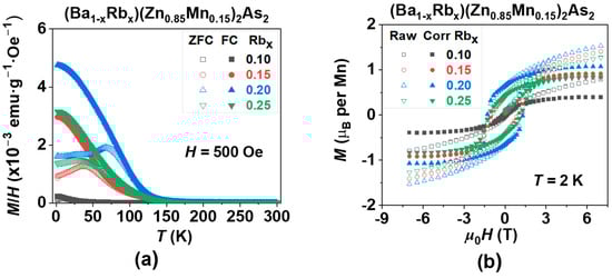 Under an external magnetic field of 500 Gauss (Oe), the magnetic susceptibility measured during zero-field-cooled (ZFC, represented by empty symbols) and field-cooled (FC, represented by solid symbols) for (Ba1−xRbx)(Zn0.85Mn0.15)2As2 (where x = 0.10, 0.15, 0.20, and 0.25) is illustrated in Figure 4. It is widely acknowledged that the ferromagnetic ordering temperature, commonly referred to as the TC, is associated with the transition of spontaneous magnetization from a value of zero to a non-zero state. This transition reflects the magnitude of the exchange integral from a microscopic perspective.