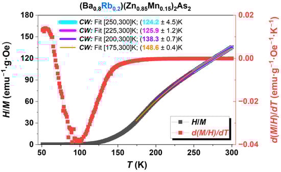 The temperature dependence of the inverse susceptibility of the polycrystalline sample (Ba0.8Rb0.2)(Zn0.85Mn0.15)2As2 is shown (black line). The analysis of the TC was conducted utilizing a modified form of the Curie–Weiss law [39], across different temperature regions for comparative analysis. Furthermore, a first-order analysis of magnetic susceptibility, d(M/H)/dT, was conducted to elucidate the broad transitions from ferromagnetic to paramagnetic states (red line).