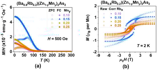 The effect of spin doping on the magnetization of (Ba0.8Rb0.2)(Zn1−yMny)2As2 (where y = 0.10, 0.15, 0.20, and 0.25). (a) DC magnetic susceptibility was assessed in a magnetic field of H = 500 Oe. (b) The magnetic hysteresis curve, M(H), was obtained through field training, along with the subtraction of the paramagnetic component, measured at a temperature of T = 2 K.