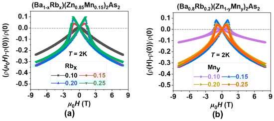 The negative magnetoresistance (MR) is presented as a function of the external magnetic field, measured at a temperature of T = 2 K. (a) (Ba1−xRbx)(Zn0.85Mn0.15)2As2 (where x = 0.10, 0.15, 0.20, and 0.25). (b) (Ba0.8Rb0.2)(Zn1−yMny)2As2 (where y = 0.10, 0.15, 0.20, and 0.25).