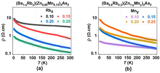 The resistivity is plotted as a function of temperature. (a) (Ba1−xRbx)(Zn0.85Mn0.15)2As2 (where x = 0.10, 0.15, 0.20, and 0.25). (b) (Ba0.8Rb0.2)(Zn1−yMny)2As2 (where y = 0.10, 0.15, 0.20, and 0.25).