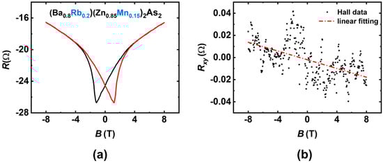 In Table 1, the sample with Rb at 20% and Mn at 15% exhibited a maximum TC of 138 K, which is significantly lower than that of BKZMA. Previous research on BKZMA [15] has revealed that a sufficient carrier concentration can suppress the short-range antiferromagnetic interactions between the nearest Mn-Mn pairs, thereby inducing a higher TC. We infer that the lower carrier concentration in BRMZA results in a lower TC. Consequently, we have measured the Hall effect in the sample with Rb at 20% and Mn at 15% using a homemade Hall bar structure, as shown in Figure 9. The raw data are shown in Figure 9a, which contains a significant longitudinal resistance signal resulting from electrode asymmetry. To extract the genuine Hall signal, we performed an antisymmetric process as follows: