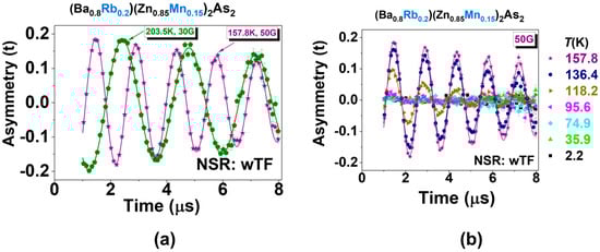 μSR is a sensitive technique utilized to detect both static and dynamic magnetism in various magnetic and superconducting systems [59,69]. Pioneering μSR research on DFSs focused on thin films subjected to appropriate heat treatment, which demonstrated a sharp transition at the TC with a complete magnetic volume fraction [70]. Inspired by this, the μSR technique was applied to a new class of DFSs featuring independent spin and charge doping mechanisms to investigate their static and dynamic magnetism [13,16,29,41,47,48,52,67,71,72]. To eliminate the possibility of magnetic impurity clusters in (Ba0.8Rb0.2)(Zn0.85Mn0.10)2As2, we employed the most direct weak transverse field (wTF)-μSR measurements. Figure 10 exhibits the time spectrum, which was analyzed using the following function [59].