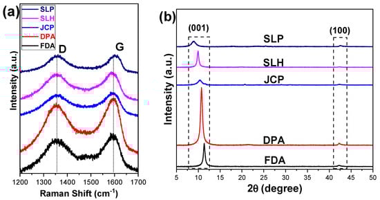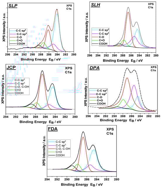 Additionally, the full width at half maximum (FWHM) values for the 2θ peaks were calculated, as they provide information regarding well-ordered domains. The calculated FWHM values are as follows: SLP = 1.23, SLH = 0.45, JCP = 1.18, DPA = 0.53, and FDA = 0.46. Samples SLH, FDA, and DPA present narrower 2θ peaks, indicating a higher degree of structural order for these GO samples.