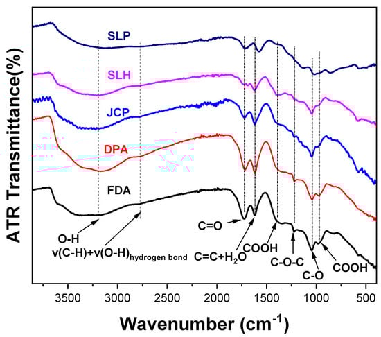 For the identification of the functional groups present in each sample, attenuated total reflection (ATR-FTIR) spectroscopy was performed. ATR-FTIR spectra were obtained in the range 4000–400 cm−1 (Figure 2). Peak assignments (Table 3) provided insights into the chemical composition of the samples and the presence or absence of oxygen-containing groups.