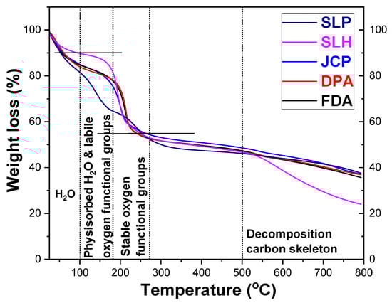 In the TGA thermographs presented in Figure 3, it is observed that GO is not a thermally stable material. The significant weight loss at a temperature below 100 °C is due to the loss of water molecules from the surface of GO, while at temperatures between 100 °C and 180 °C it is due to physiosorbed water and unstable oxygen-containing groups. The mass loss above 200 °C is due to the removal of the more resistant oxygen-containing groups [31,46,47,48]. Finally, the rapid mass loss starting at 500 °C can be attributed to the decomposition of the carbon skeleton of GO. From the TGA measurements (Figure 3), we can conclude that the weight loss observed at 270 °C for all GOs is approximately 40%, which likely originates from either adsorbed water or oxygen-containing functional groups. In other words, the functional groups present in all the GO samples account for approximately 40% of the total weight. SLP is the sample that exhibits the highest water loss, either from the surface of GO or from physisorbed water. It shows the lowest intensity of the IR band corresponding to C=O bonds (~1700 cm−1) and almost no detectable band associated with COOH groups (~1400 cm−1). Given that carboxyl groups retain water through both C=O and –OH interactions, it is rational to conclude that SLP, having a low concentration of these groups, has a reduced capacity to retain water. This is further supported by the fact that SLP is a single-layer material, where water is primarily absorbed on the surface, making it easier to lose compared to water trapped between layers in multilayer structures.