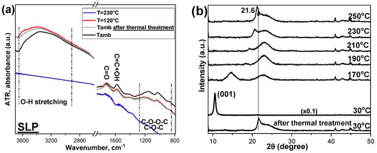 From the ATR-IR spectra of all samples (Figure 5, left column), it is observed that increasing the temperature to 120 °C leads to a progressive reduction in the intensity of specific vibration bands, such as the -OH stretching in the region ~3000–3500 cm−1. When the samples are heated up to 230 °C, the intensity of the -OH group bands is greatly reduced (JCP and SLH) or even vanishes (SLP, FDA, and DPA). During the heating of SLP, SLH, FDA and DPA, a decrease in the intensity of the bands corresponding to ethers, peroxides, epoxides, and ketones (~ 1400–800 cm−1) is observed. In the case of FDA and SLH the decrease in these functional groups is not so evident. As stated above, the band at ~1600 cm−1 is attributed to C=C bending vibrations of the graphene layers (1580 cm−1) and to adsorbed/interfered water molecules (1616 cm−1). For all samples, it is obvious the evaporation of naturally adsorbed water at a temperature of 120 °C (red spectra), while the band corresponding to carbonyl (C=O) at ~1720 °C remains essentially unaffected. However, when samples are heated to 230 °C (blue spectra), a decrease in carbonyls (C=O) ~1720 cm−1 and carboxyls (COOH) ~1380 cm−1 band intensity is noticed, with the FDA and JCP samples being the least affected. For the other samples, the carbonyls (C=O) ~1720 cm−1 and carboxyls (COOH) ~1380 cm−1 are not particularly temperature-dependent. Finally, when all the GO samples are re-exposed at room temperature conditions (grey spectra), SLP, SLH, and JCP samples recover to some extent the intensity for the 3000–3500 cm−1 band achieved for samples prior to thermal treatment, and also a slight increase in the intensity of the peaks associated with –OH groups at 1600 cm−1 is also observed, indicating the presence of functional groups capable of adsorbing water. This behavior is consistent across all samples except for FDA.