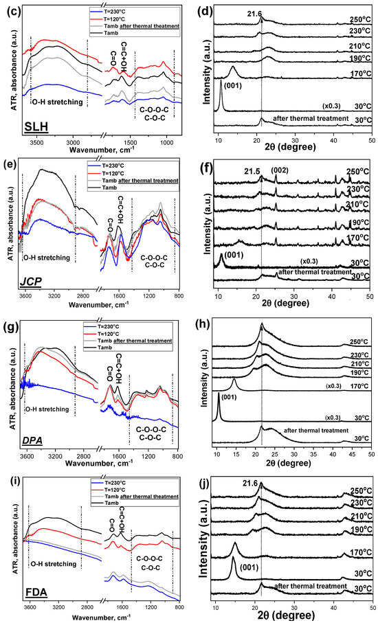 ATR-IR (left column) and XRD (right column) as a function of temperature of the commercial GOs: SLP (a,b), SLH (c,d), JCP (e,f), DPA (g,h), FDA (i,j). Some of the diffractograms have been multiplied by a factor (indicated on each graph) to clearly show the position of the peaks.