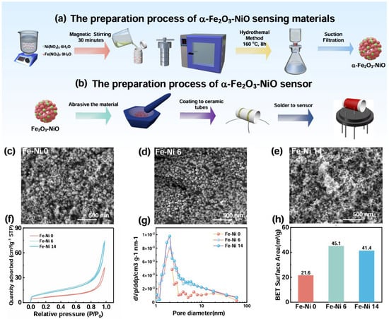 (a) Preparation process for α-Fe2O3-NiO; (b) Preparation process for sensors; SEM images of (c) Fe-Ni 0; (d) Fe-Ni 6; (e) Fe-Ni 14; (f) the N2 adsorption–desorption Isotherms of Fe-Ni 0, Fe-Ni 6, and Fe-Ni 14; (g) the pore size distribution in Fe-Ni 0, Fe-Ni 6, and Fe-Ni 14; (h) specific surface areas of Fe-Ni 0, Fe-Ni 6, and Fe-Ni 14.