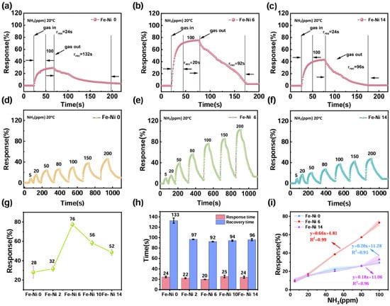 Response/recovery characteristics of (a) Fe-Ni 0, (b) Fe-Ni 6, and (c) Fe-Ni 14. Response curves of different concentrations of (d) Fe-Ni 0, (e) Fe-Ni 6, and (f) Fe-Ni 14. (g) The response values of different samples. (h) Response and recovery times of different samples. (i) Linear relationships of the responses of different concentrations.