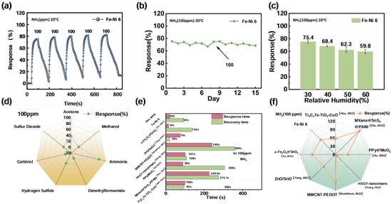 (a) Cyclic stability of Fe-Ni 6; (b) long-term stability; (c) stable responsiveness under different humidity conditions; (d) gas selectivity by Fe-Ni 6; (e) comparison of response/recovery times; (f) comparison of sensitivity [66,67,68,69,70,71,72].