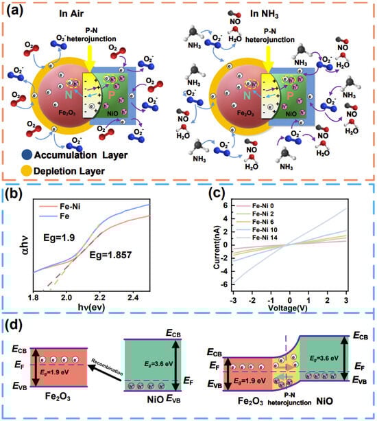 (a) Gas adsorption mechanism of α-Fe2O3-NiO; (b) the bandgap of α-Fe2O3-NiO; (c) I–V characteristic curves of different samples; (d) energy band structure of α-Fe2O3-NiO.