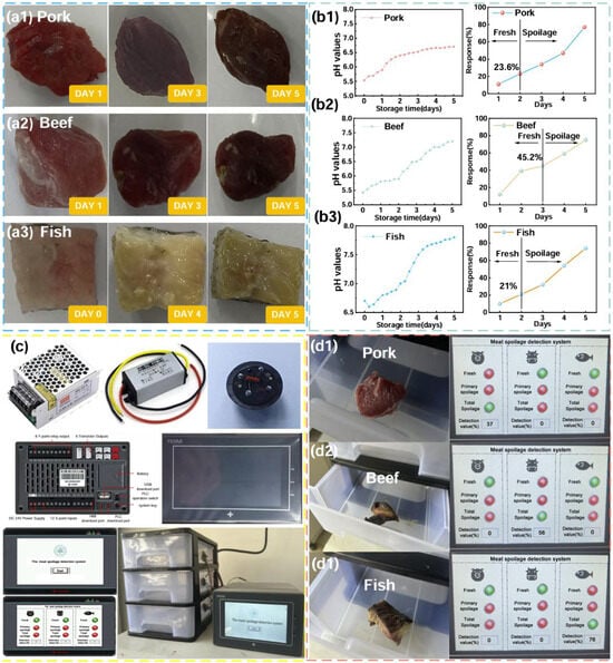 (a1–a3) The process of corruption of pork/beef/fish; (b1–b3) the PH value and sensor response criteria values for determining pork/beef/fish; (c) the meat corruption detection system; (d1–d3) actual test results of pork/beef/fish corruption detection system.