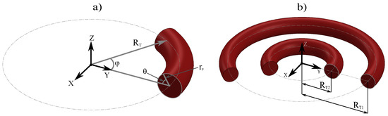 where is the position vector of any point on the toroid, is the toroid radius, measured from the origin of the coordinate system to the central axis of the toroid, is the poloidal radius, measured from the central axis of the toroid and indicating its thickness, is the poloidal angle, located in the plane of the poloidal radius, and is the azimuthal angle, located in the xy-plane of the coordinate system, as shown in Figure 1a.