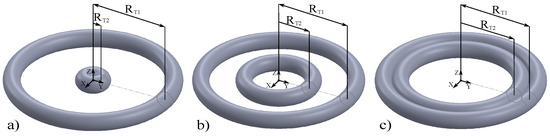 (a) The parameter indicates the variation in the toroidal radius of the inner toroid. For , nm; for (b) , nm; for (c) , nm.