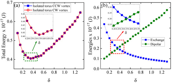 (a) Total energy of an isolated nanotorus as a function of the toroidal radius parameter, , for both counterclockwise (CCW) and clockwise (CW) vortex configurations. The CCW vortex is represented by blue squares, while the CW vortex is represented by red circles. The inset provides a zoomed-in view of the energy minimum near . (b) The graph separates the energy contributions, divided into exchange and dipolar contributions, with exchange energy shown by blue squares and dipolar energy by green circles.
