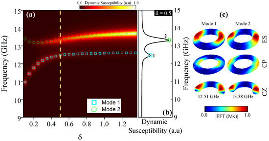 (a) Frequency of the resonant modes as a function of parameter for an isolated nanotorus with a fixed poloidal radius of 50 nm. Two distinct resonance modes are observed: mode 1 (squares) and mode 2 (circles). (b) Dynamic susceptibility profile (yellow dashed line in Figure 4a) at , showing the relative amplitude of modes 1 and 2. (c) Spatial distribution of the resonant modes for . The color code represents the amplitude of the FFT applied to the x-component of the magnetization in the external surface (ES), central plane (CP) and the z-axis direction (CZ), where red indicates a higher spin amplitude and blue signifies zero spin amplitude.