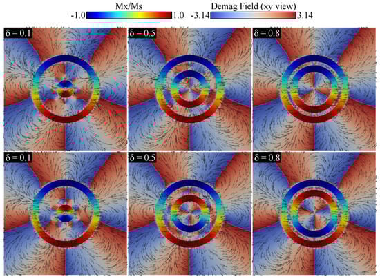 This difference in dynamic magnetic response at the frequencies of resonant modes when two configurations are present has been reported in another nanostructure. Yang et al. [46] investigated spin-dynamic modes in cylindrical nanotubes with vortex chirality configurations at the ends, showing that these configurations significantly affect the dispersion of standing spin waves (SWs). The nonreciprocal propagation of SWs was attributed to dynamic dipolar fields in an azimuthally magnetized ferromagnetic tube, as reported by Talora et al. [47]. McKeever et al. [6] observed that when concentric permalloy rings with opposite chirality vortices are perturbed by pulse excitation, the demagnetizing field aligns the magnetization in an antiparallel direction in adjacent rings, leading to frequency beating and modulation. For our system, we determined the demagnetizing fields for three cases—, , and —as shown in Figure 7.