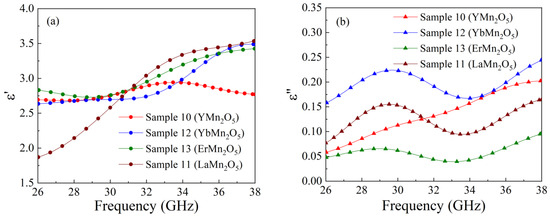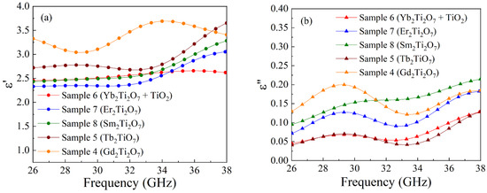 Let us discuss why the imaginary part of the dielectric permittivity is essentially less than the real one, i.e., << . Of course, we deal now with the frequency range of 26 to 38 GHz. Following the data from Table 5, is only 2–4% from for the samples with ErMn2O5, Tb2Ti2O7, Yb2Ti2O7 + TiO2, and Er2TiO5 particles.