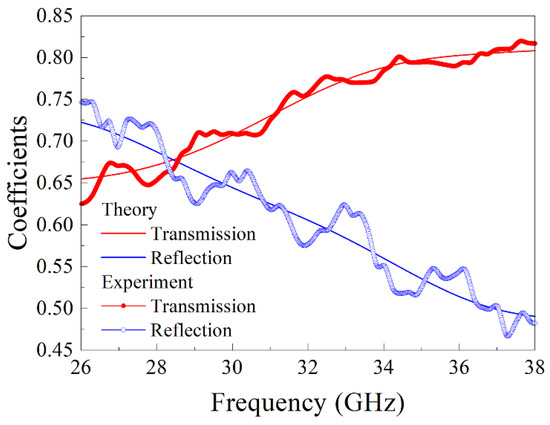 The view of the frequency dependence of transmission and reflection coefficients is determined by the following factors: (1) the relation between the sample thickness d and the wavelength , (2) the value of the absorption coefficient, and (3) the dispersion of TE10 mode in the rectangular waveguide. The frequency dependences of transmission and reflection coefficients are used in order to restore the effective dielectric permittivity of a nanocomposite medium [35]. Let us denote the impedance for the part of the waveguide with the sample as and the impedance outside the sample as . The complex propagation constant in the sample is indicated as . The thickness of the sample equals d, and the greater side of the waveguide is a. The complex transmission T and reflection R coefficients can be calculated via the formulas [36,37]