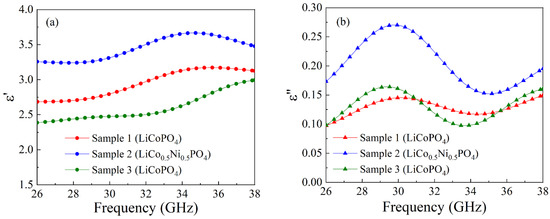 Small differences between the calculated and measured values of the coefficients are caused by the minor mismatch of the tract. Frequency dependences of the real and imaginary parts of dielectric permittivity are shown in Figure 9. The ε′ dependence is a nonmonotonic function for samples 1 and 2, and ε″ has a maximum for all samples. The inequality ε″ << ε′ is realized for all samples in the whole frequency range 26–38 GHz. The mean values of the real and imaginary parts of dielectric permittivity averaged over the range 26–38 GHz are presented in Table 5.