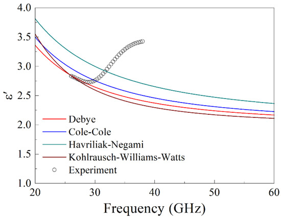 As an example, we now consider the results of the approximations of the frequency dependence of the real part of permittivity for sample 12 using the Debye, Cole–Cole, Havriliak–Negami, and Kohlrausch–Williams–Watts models, which are shown in Figure 10.