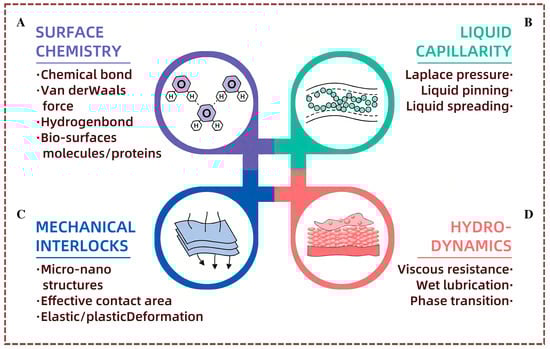 The phenomenon of surface contact in the interactions between solid surfaces usually involves the intrinsic material properties of the solid surfaces, such as elasticity and surface chemical properties, as well as different structural forms at the micro-scale, such as columnar structures, protrusions, grooves, or random roughness. Under dry contact conditions, material properties and structures have a significant impact on adhesion performance, including adhesion force and friction. Specifically, the surface chemical characteristics have an impact on contact interactions at the molecular level through high-activity chemical groups that form strong covalent bonds or through weak hydrogen bonds or van der Waals bonds (Figure 1A). Surface structures, on the other hand, adjust adhesion performance by changing the material’s elasticity and creating or eliminating mechanical interlocks at the interface (Figure 1B). Under wet contact conditions, the liquid present at the interface becomes another key factor that determines the contact performance, with liquid properties including strong capillary action at the micro- and nanoscale, phase transitions with temperature increases, and significant fluid dynamics under shear or pressure (Figure 1C,D). These properties can regulate liquid movement or generate acting force at the interface, thereby promoting solid contact interactions and creating unique functionalities that regulate the adhesion performance. Understanding these interface contact mechanisms is of great importance for developing deep strategies for medical device design, thereby improving medical applications.