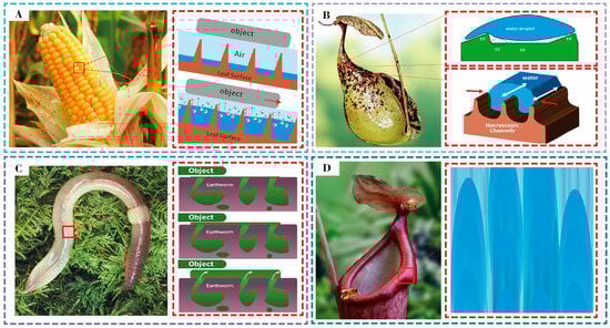 Certain surfaces have been found to exhibit anti-adhesive or slip properties by reducing adhesion, such as the dry contact surface of corn leaves and the moist inner wall of the pitcher plant’s trap. The surface of corn leaves is covered with longitudinal and transverse ridged structures, which help capture air between interfaces and reduce the actual contact area, thereby reducing adhesion. When the temperature rises and interface moisture evaporates, the closed grid-like ridges can generate the water vapor [27,28], further promoting contact separation and forming anti-adhesive properties at high temperatures (Figure 2A). Pitcher plants, which are carnivorous plants, have slippery inner walls of their pitcher traps that prevent the fall of insects by creating a low-adhesion surface. This surface is described as having a waxy coating and is arranged in crescent-shaped protrusions. Because of the synergistic effects of low-surface-energy materials and layering structures [29], the surface exhibits super hydrophobicity and super lubricity (Figure 2B). This unique surface structure and material are crucial for forming a non-adhesive surface under dry contacts. However, in these contact surfaces, the further reduction in adhesion is constrained by the existence of solid–solid mechanical interlocks.