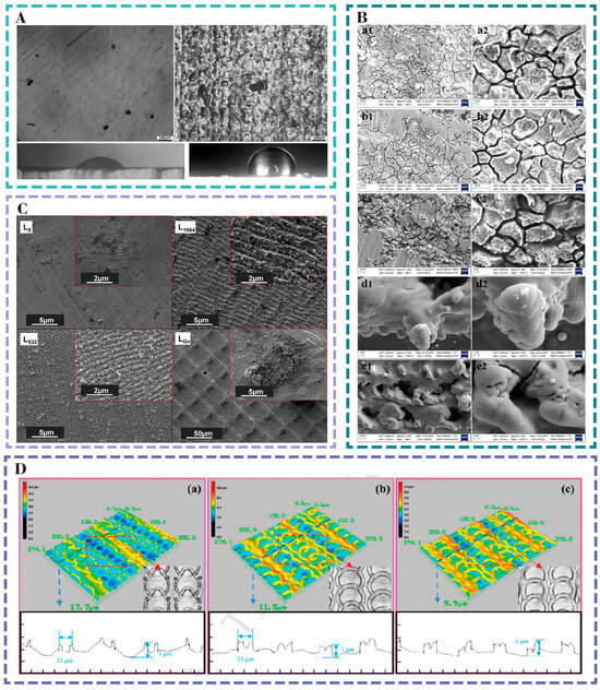 (A) 3D SEM images of the corroded wavy structure and laser-textured 304L stainless steel surface, showing increased hydrophobicity. Reproduced with permission of Gupta et al., 2019 [52]. (B) SEM images of surfaces treated at different laser energy densities with 20 mm s−1 scanning speed, showing texture and morphology changes with increasing energy density. (a1) 2.69 J/cm2, (b1) 3.96 J/cm2, (c1) 6.28 J/cm2, (d1) 8.14 J/cm2, (e1) 9.55 J/cm2, (a1–e2) are magnified images, respectively. Reproduced with permission of Lu et al., 2020 [53]. (C) SEM images after electrochemical corrosion testing for control and laser-irradiated samples, highlighting pronounced surface structures and corrosion marks. Reproduced with permission of Saqib et al., 2022 [54]. (D) Comparison of 3D morphology, surface roughness, and elemental analysis of laser-textured surfaces. Reproduced with permission of Xu et al., 2019 [55].