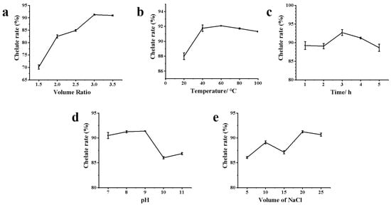 Figure 1. The chelation rate of ZOP-NPs-AgNPs under different influencing factors: (a) the volume ratio of AgNO3 and polysaccharide; (b) temperature; (c) time; (d) pH; (e) the volume of NaCl.